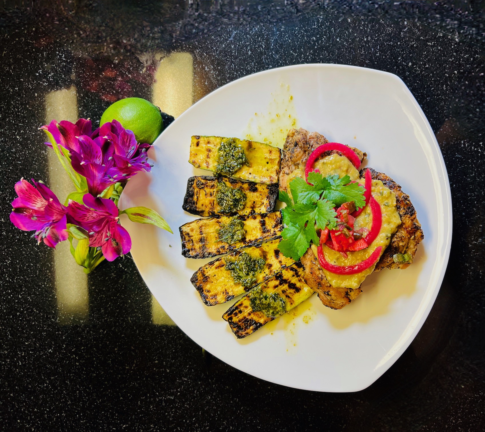 Chicken thigh covered in tomatillo sauce, pickled red onion, radish pico and served with grilled zucchini topped with pumpkin seed pesto and cilantro oil.
