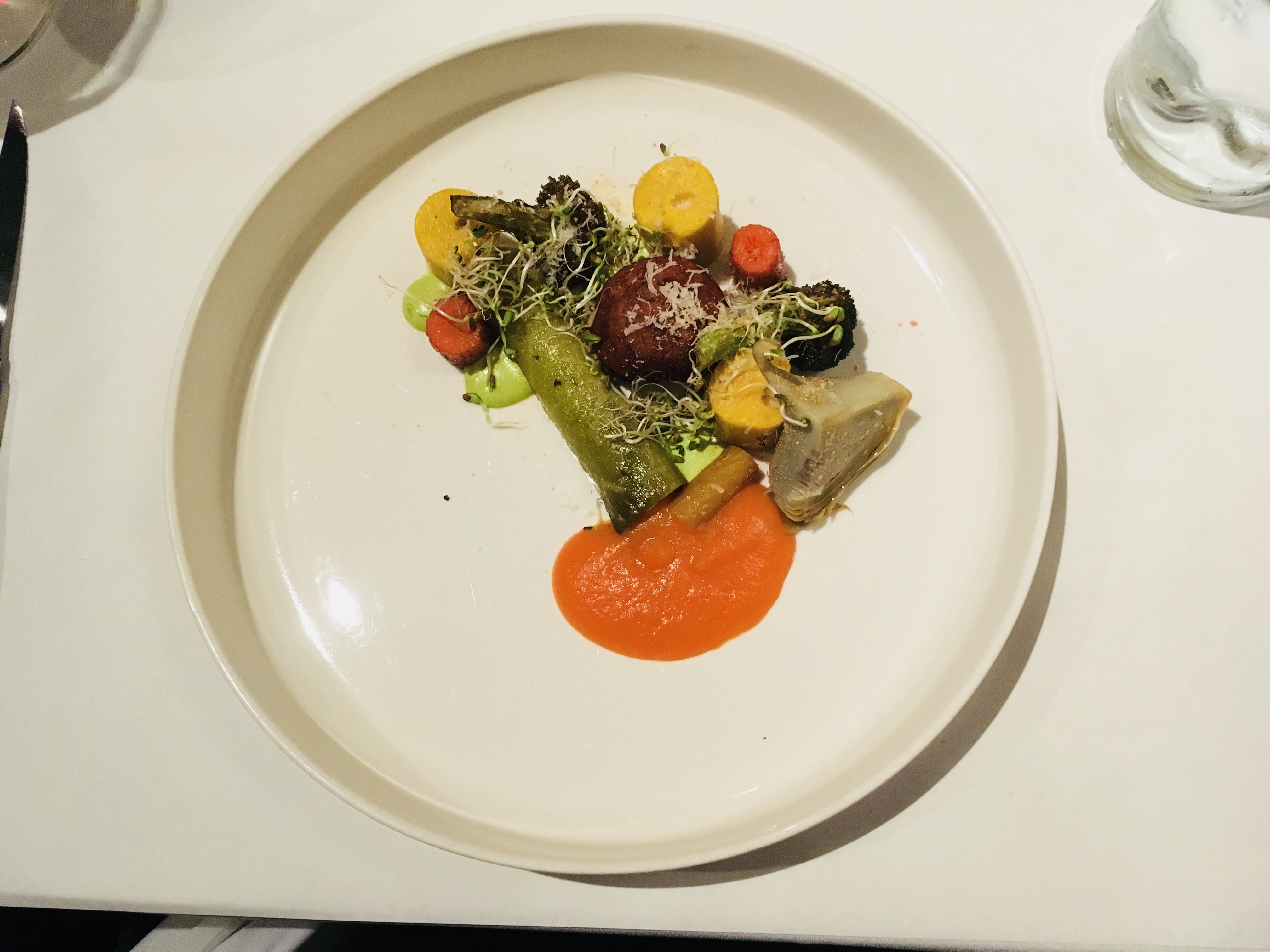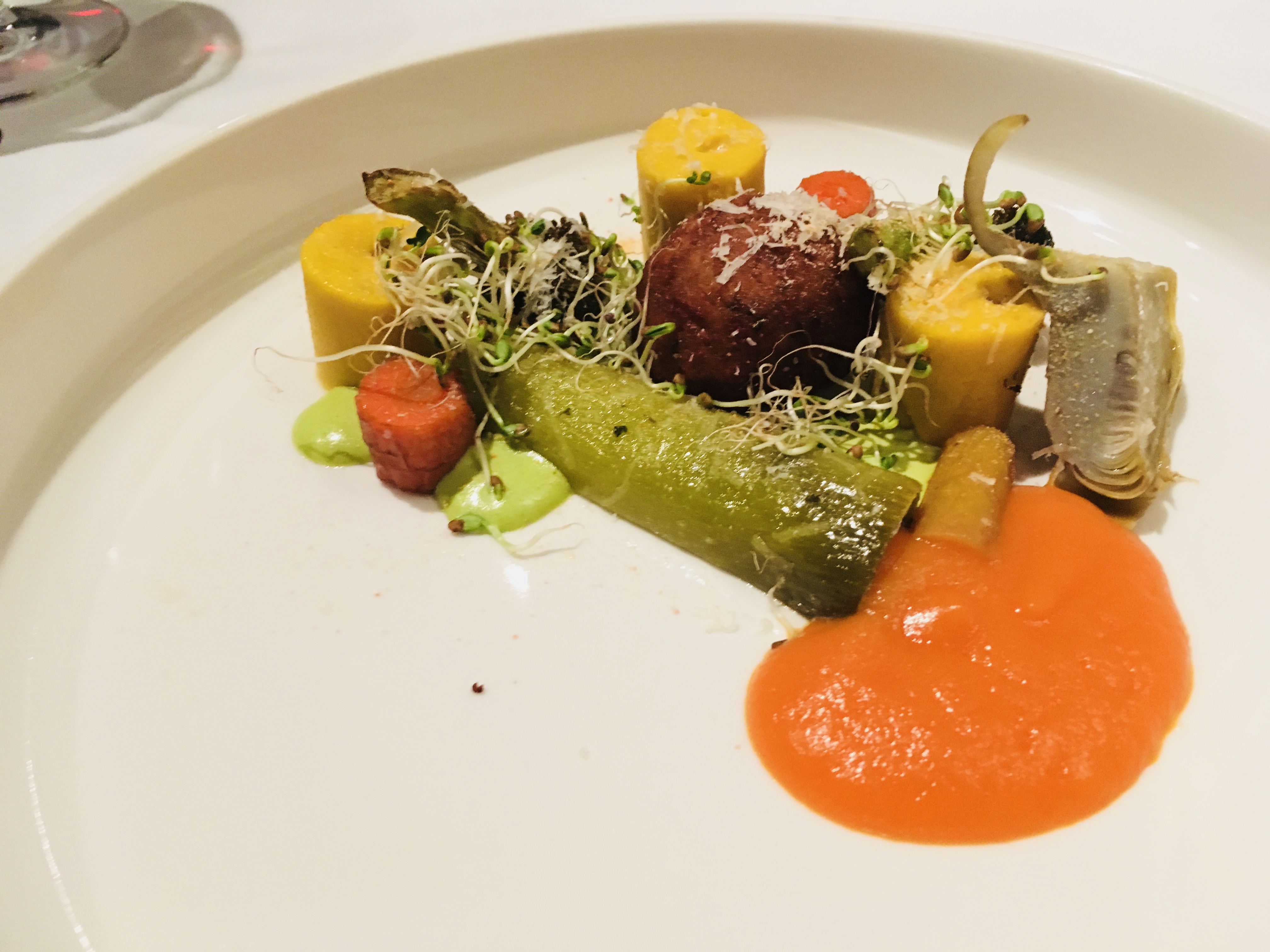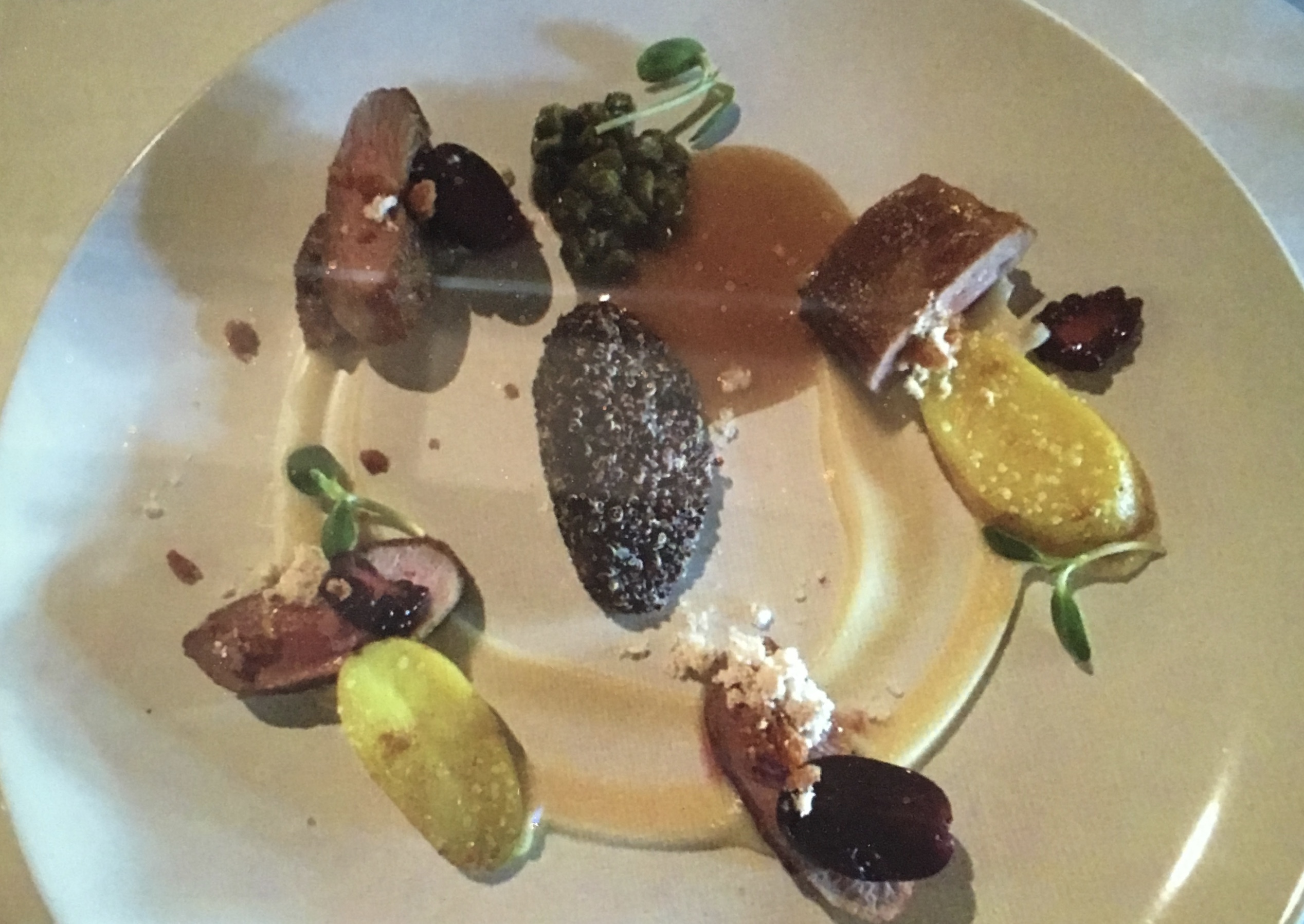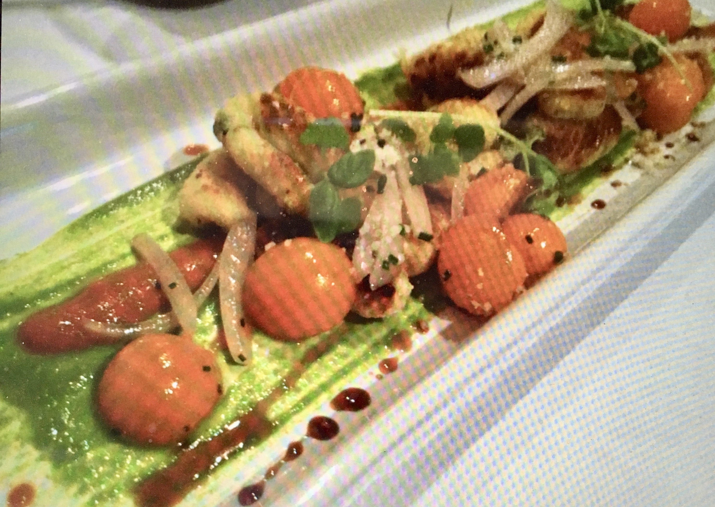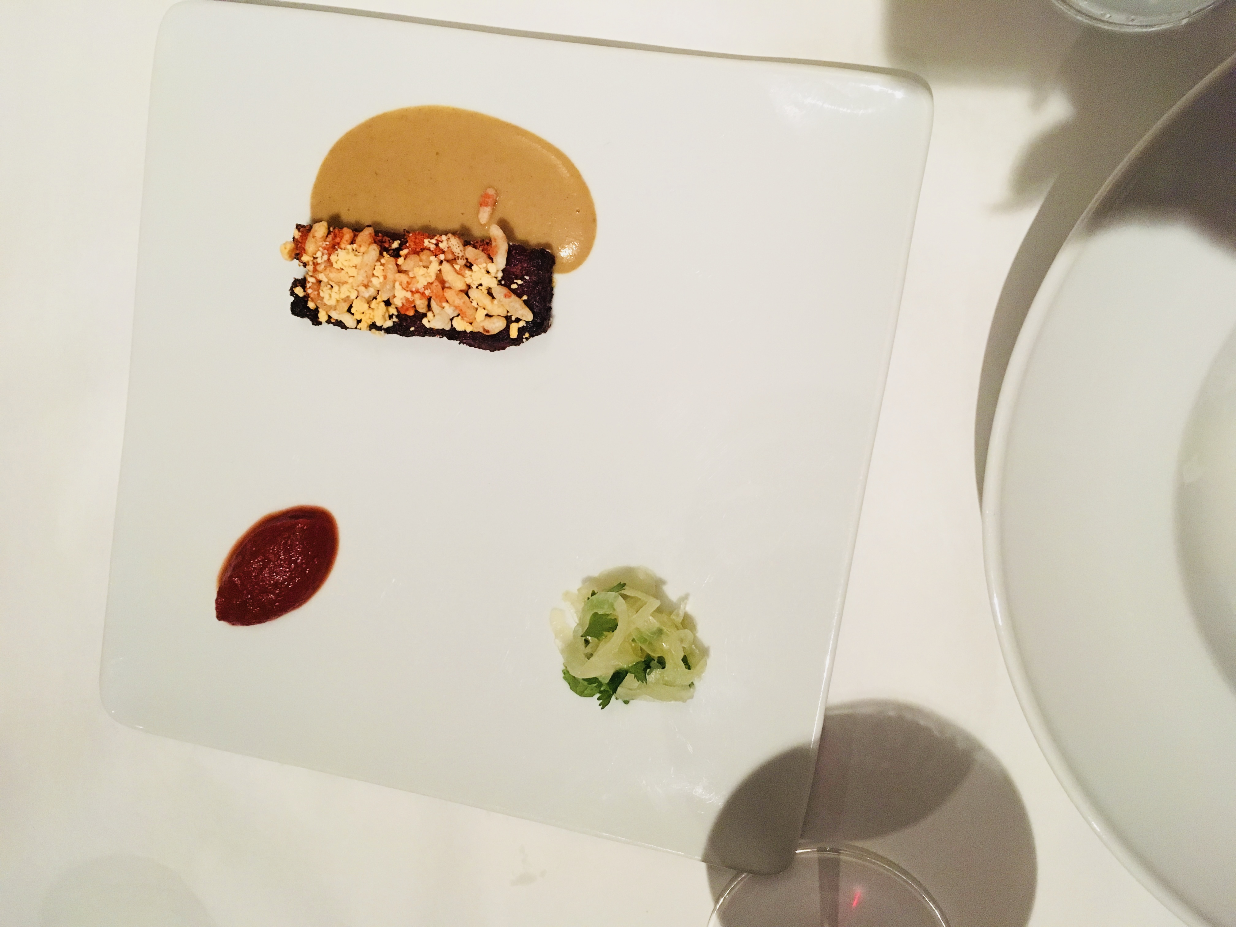 Carrot Gnocchi (the yellow that looks like chunks of carrots), Gold Lentil Meatball, Artichoke, Melted Leeks, Fried Broccoli, Leek Puree and Seascape Cheese. Eye Catching plate full of beautiful colors and all very good flavors. It’s just a Leek but the leek was the most amazing delicious leek I’ve ever tasted and really did melt in my mouth. The Golden Lentil Meatball was made like a very good fluffy falafel….really super fluffy, light, seemed free of oil with a nice thin crispy exterior. The Fried Crispy Broccoli florets were nice, crispy and added that deeper flavor the plate needed. The Carrot Gnocchi had a nice Carrot flavor but the texture and taste was not familiar to me as a gnocchi…….It was something completely different….It was an interesting journey of vegetables.