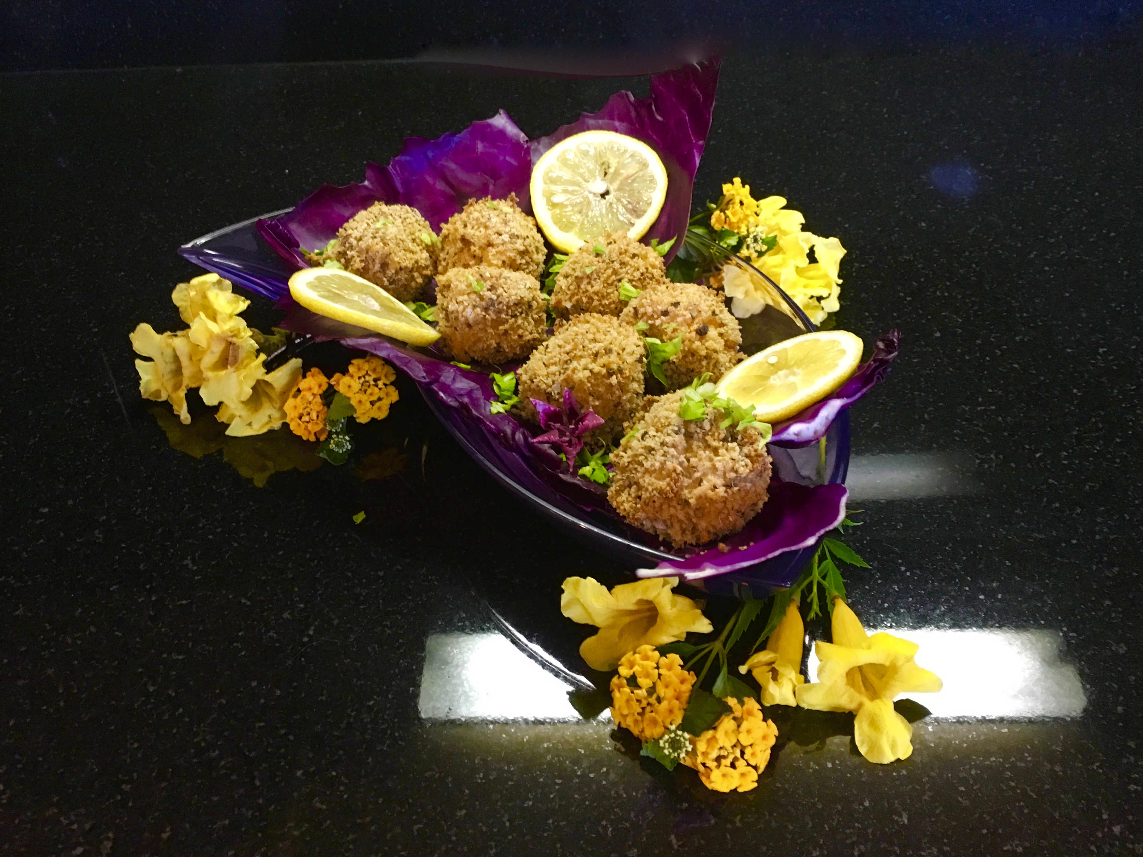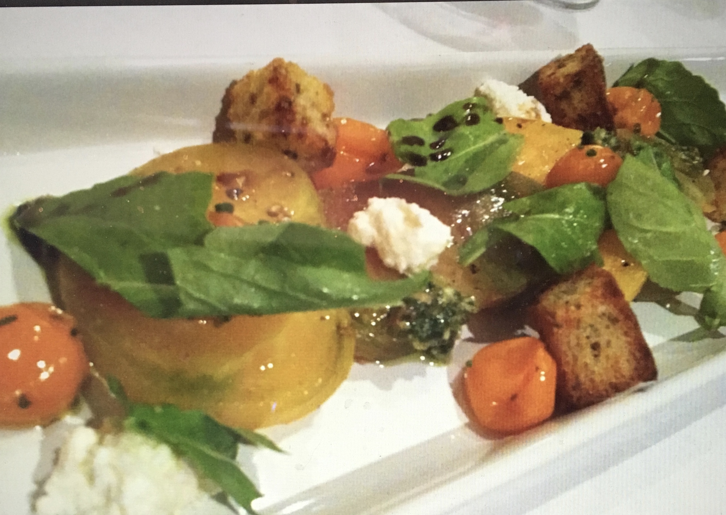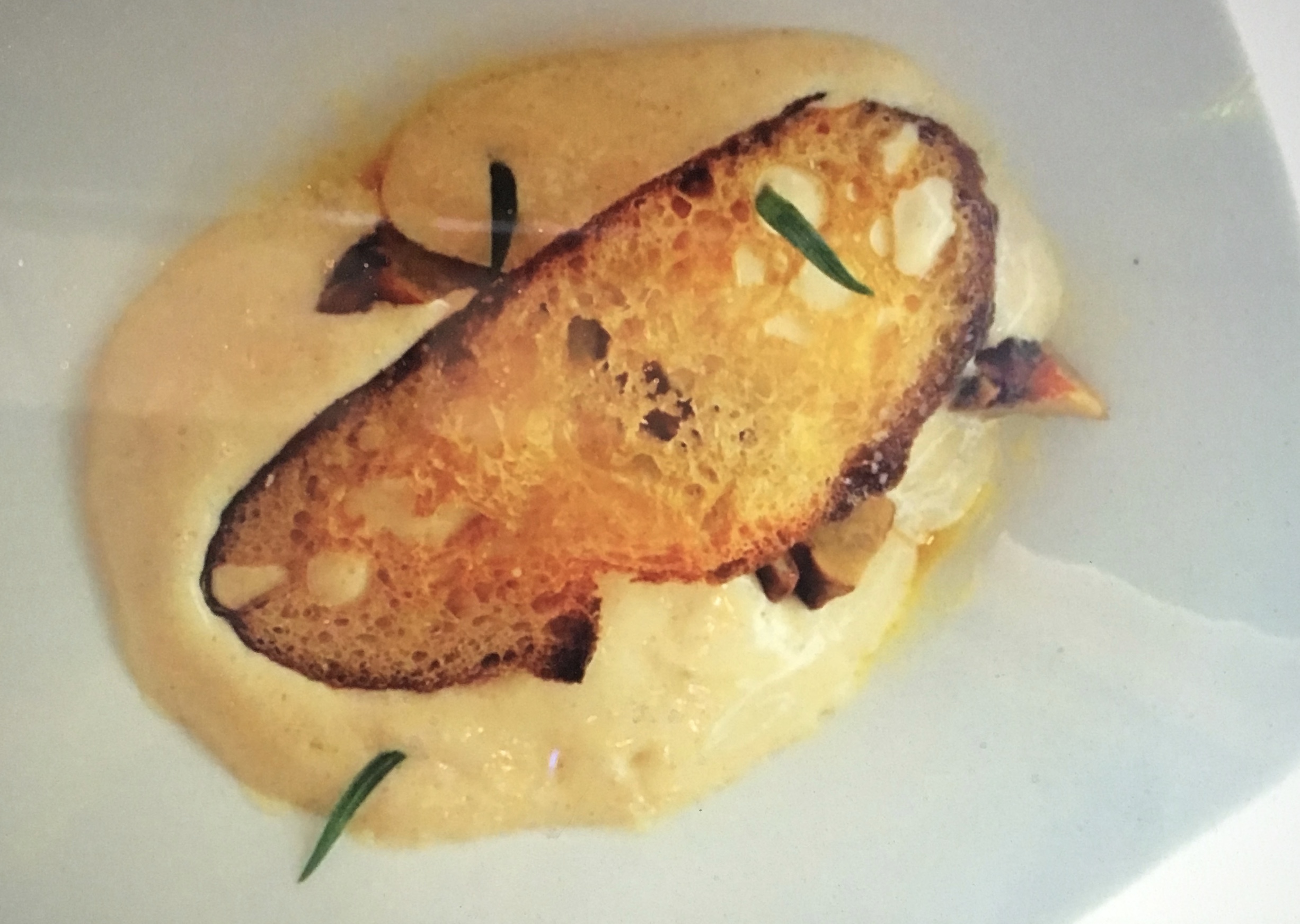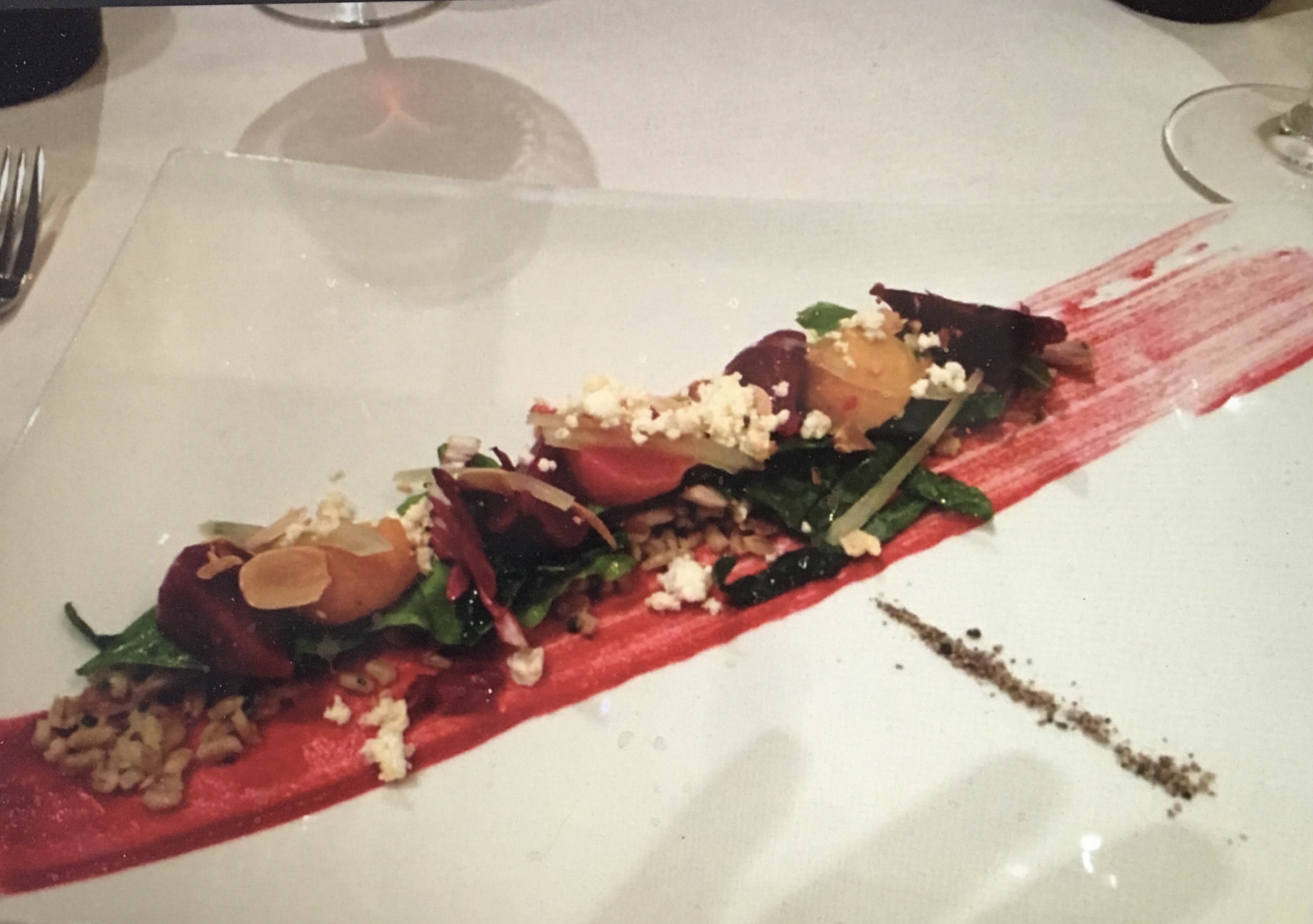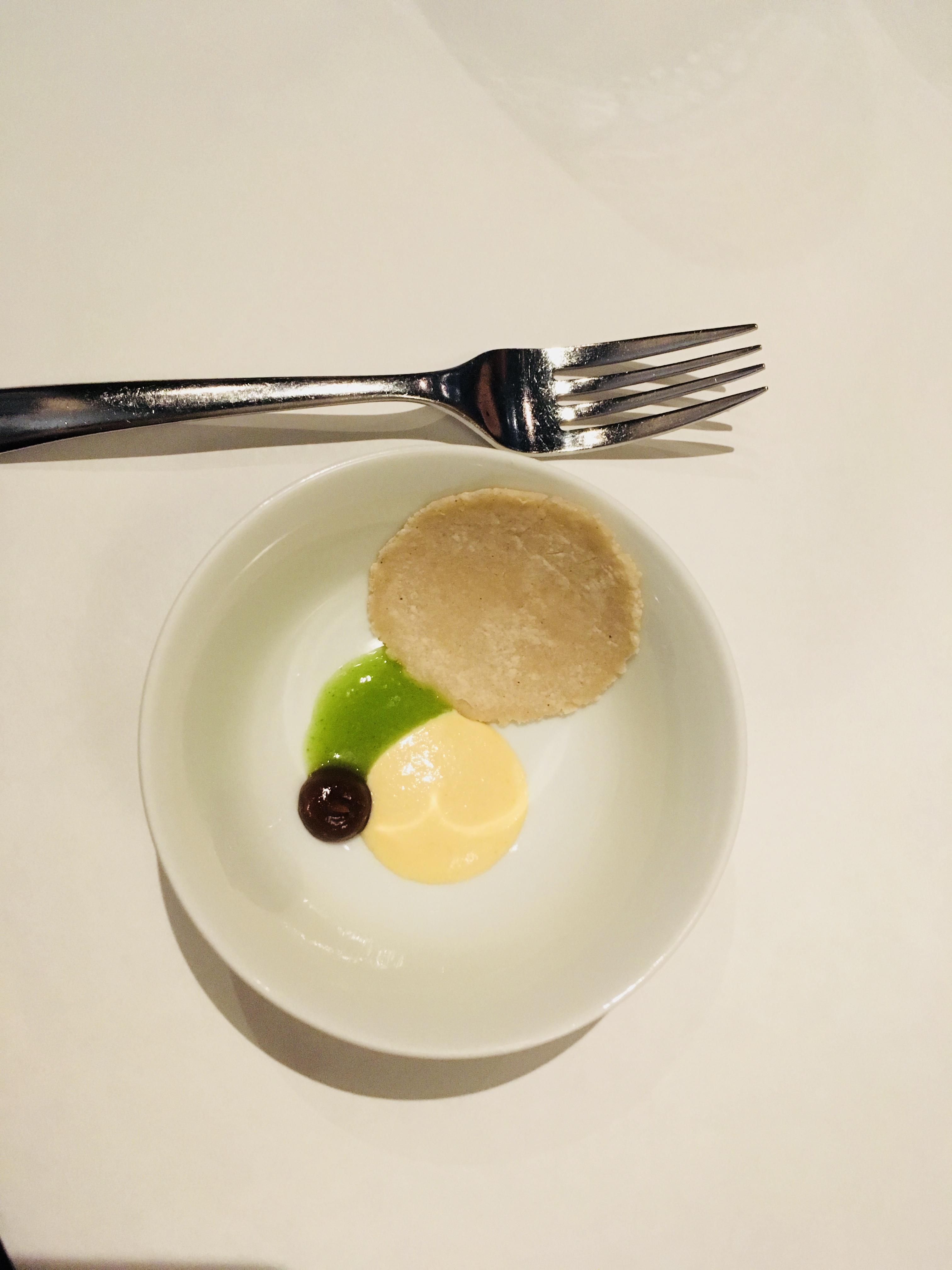 Carrot Gnocchi (the yellow that looks like chunks of carrots), Gold Lentil Meatball, Artichoke, Melted Leeks, Fried Broccoli, Leek Puree and Seascape Cheese. Eye Catching plate full of beautiful colors and all very good flavors. It’s just a Leek but the leek was the most amazing delicious leek I’ve ever tasted and really did melt in my mouth. The Golden Lentil Meatball was made like a very good fluffy falafel….really super fluffy, light, seemed free of oil with a nice thin crispy exterior. The Fried Crispy Broccoli florets were nice, crispy and added that deeper flavor the plate needed. The Carrot Gnocchi had a nice Carrot flavor but the texture and taste was not familiar to me as a gnocchi…….It was something completely different….It was an interesting journey of vegetables.