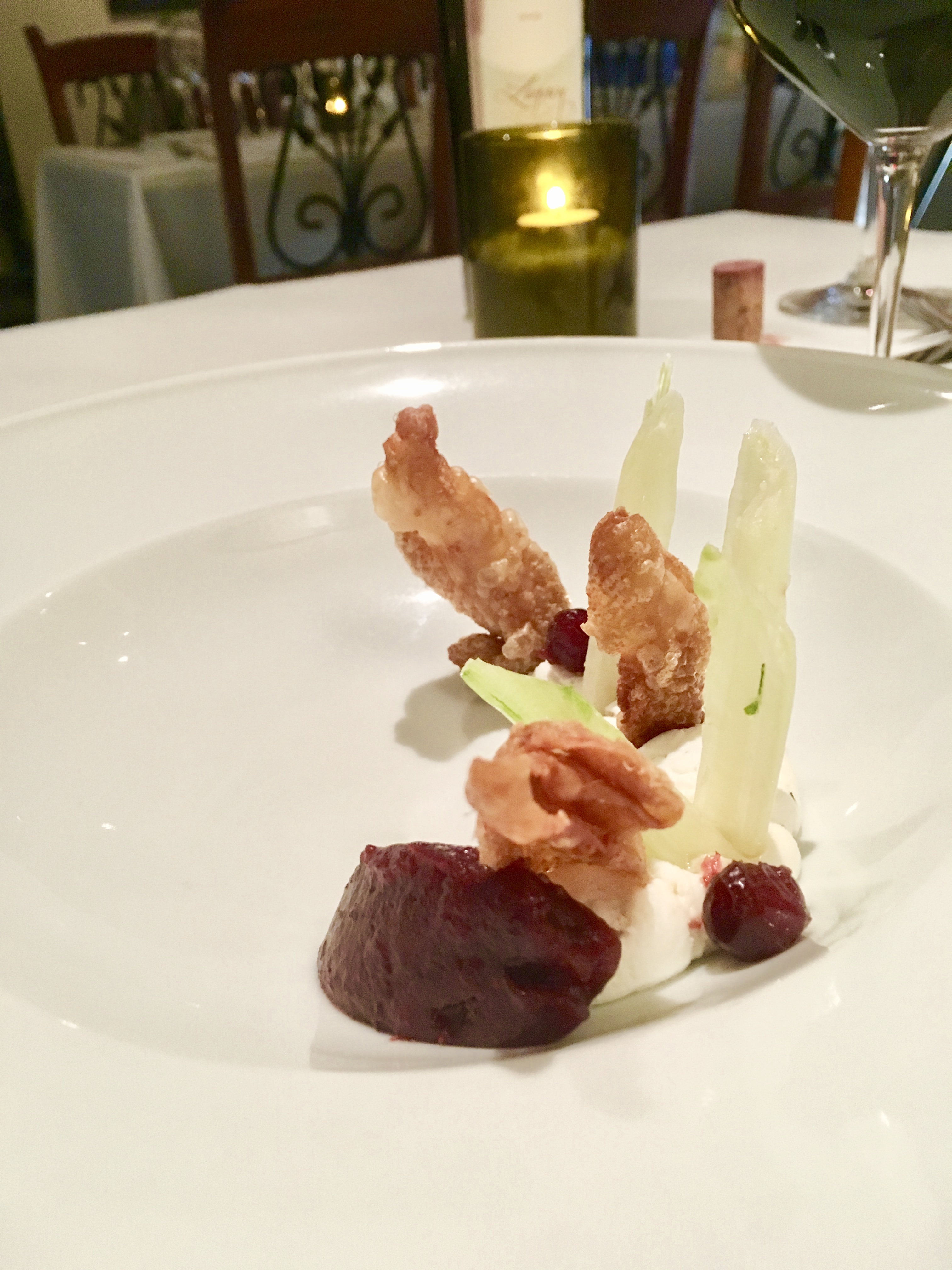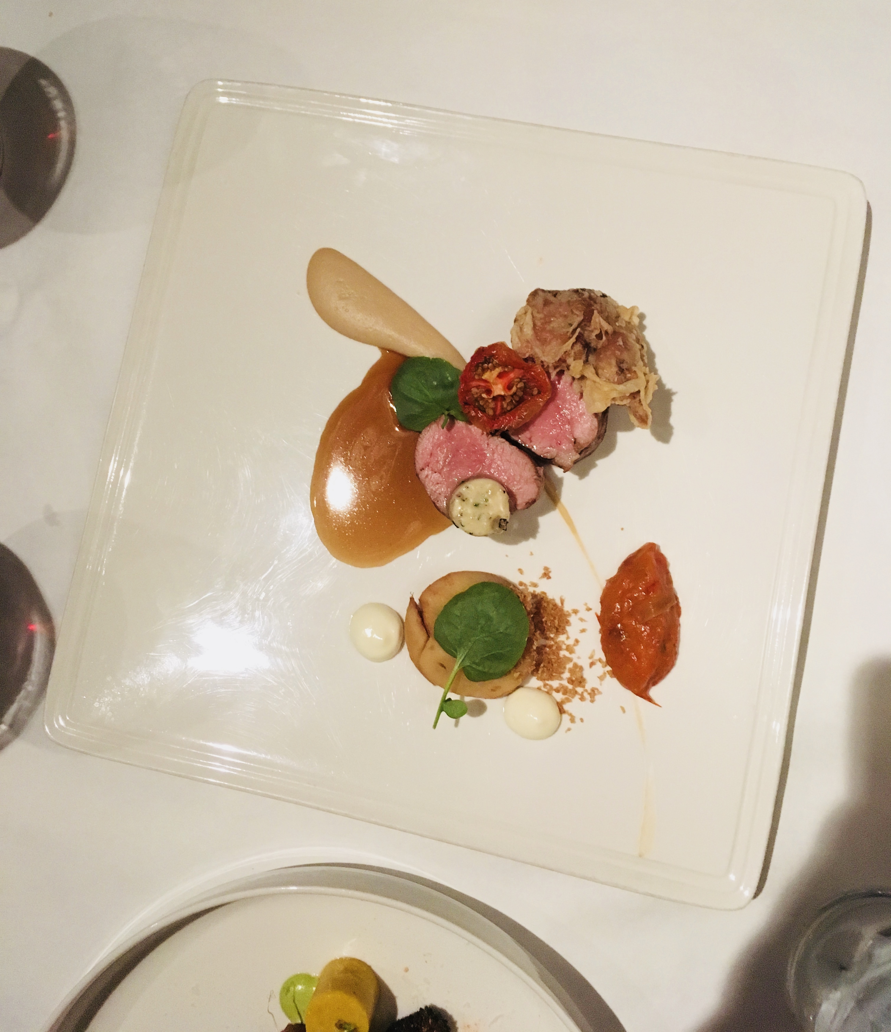 Veal Tenderloin, Chicken of the Woods Mushroom (fried and crispy by the veal), Celery Root under the Watercress Leaf, Camparis, Garlic Emulsion, Marrow Butter and Mushroom Jus. Everything was masterfully prepared and all was well seasoned.