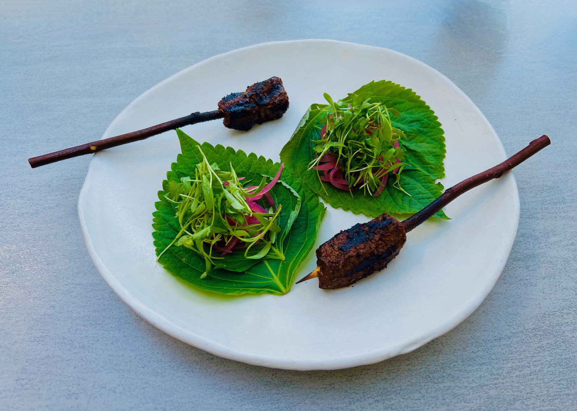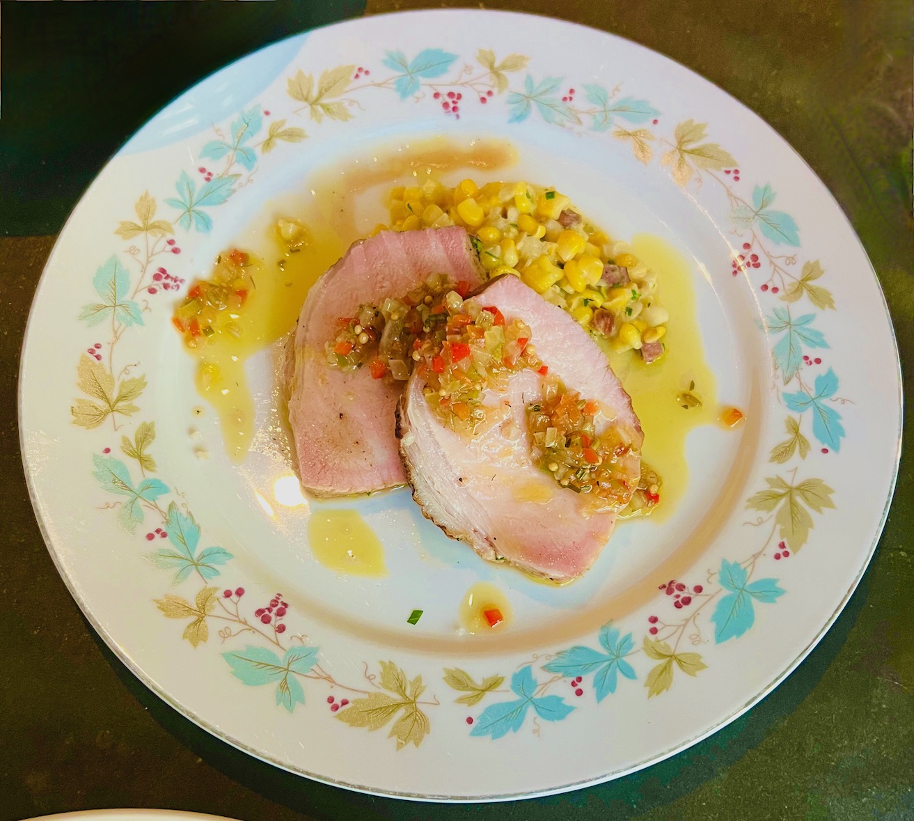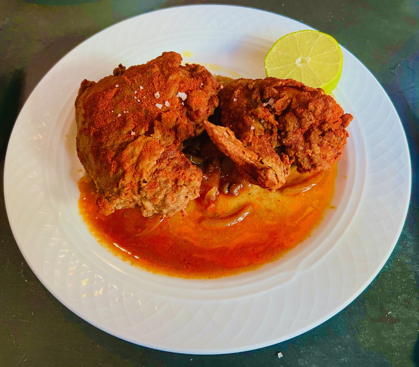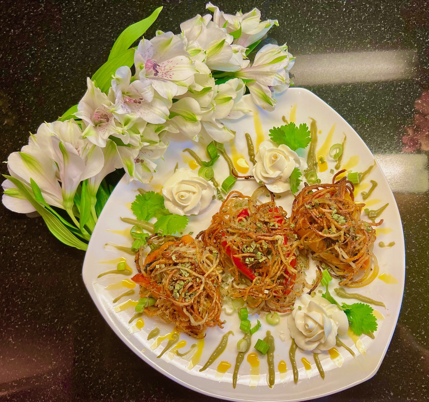 This recipe is my artsy variation of the Peruvian Dish Papa Rellenas………Just so you know Papa Rellenas are fried potato croquettes stuffed with seasoned beef filling with hard eggs. I did similar flavors but did something different. A word of warning…….This recipe called for several different Peruvian Peppers that you might not have… I used aji panca paste in the meatloaf for the main flavor. I used dried yellow Peruvian peppers in the Onion salsa (they are really great….a flavorful not too hot pepper) I recommend just a little bit of aji amarillo paste to flavor the potatoes (or a Peruvian sauce made with aji amarillo paste)……I also garnished with Peruvian Sweet Drop peppers. or me this recipe made 6 portions that aren’t the biggest.