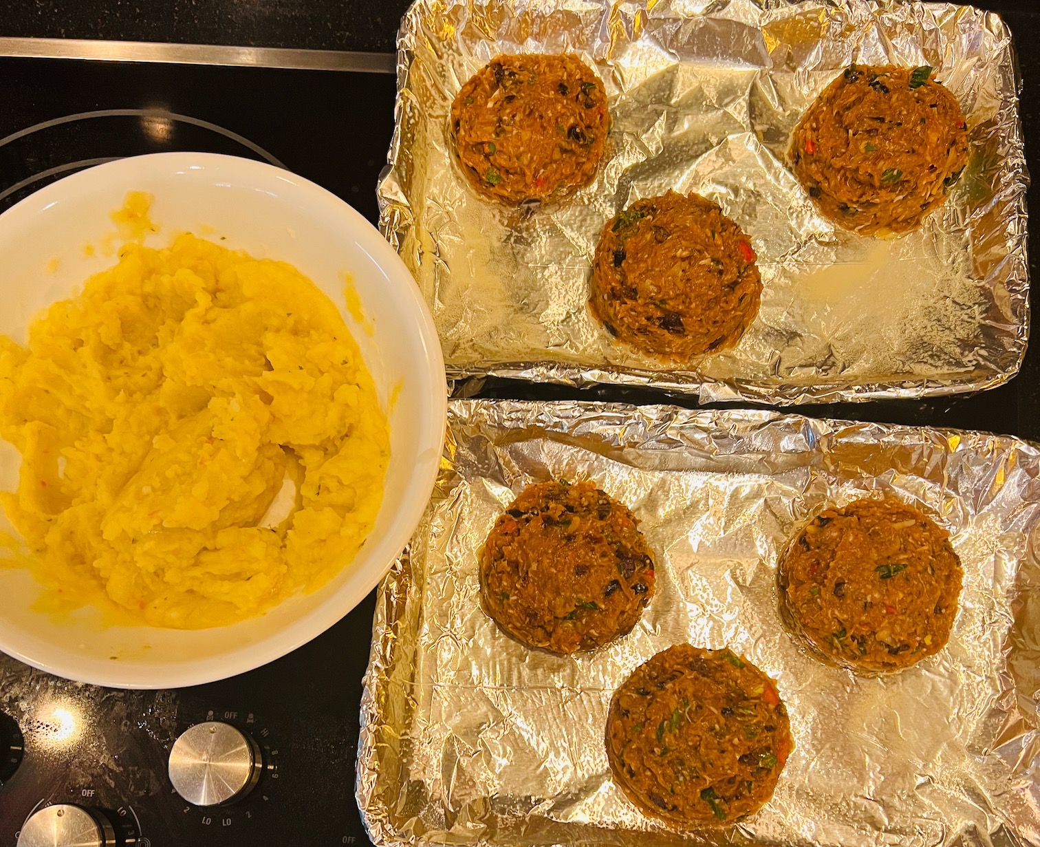 The first things to do are to boil the potatoes, then the eggs (if you haven’t already). The potatoes get mashed with either a very small amount of aji amarillo paste or a small amount of yellow cilantro sauce (that is made with aji amarillo) If you used a good amount of salt to boil the potatoes then they probably are seasoned enough…If not add some salt as needed. The eggs should go in an ice bath when done. When they are cool enough to handle peel them and keep the potatoes and eggs to the side.