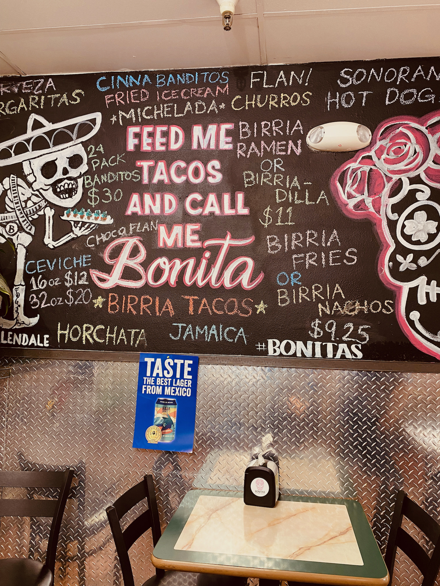 Bonita’s is a small casual Mexican Restaurant located in Glendale Arizona. They are open seven days a week for breakfast, lunch, and dinner. They offer a varied menu of breakfast burros, combos that include rice and beans (priced $7.50-$11. subject to change), assorted appetizers like miniature chimis, soups, all kinds of different tacos (street sized priced at only $1.50 subject to change), burros, birria ramen, children’s menu, desserts, limited alcohol, and more!