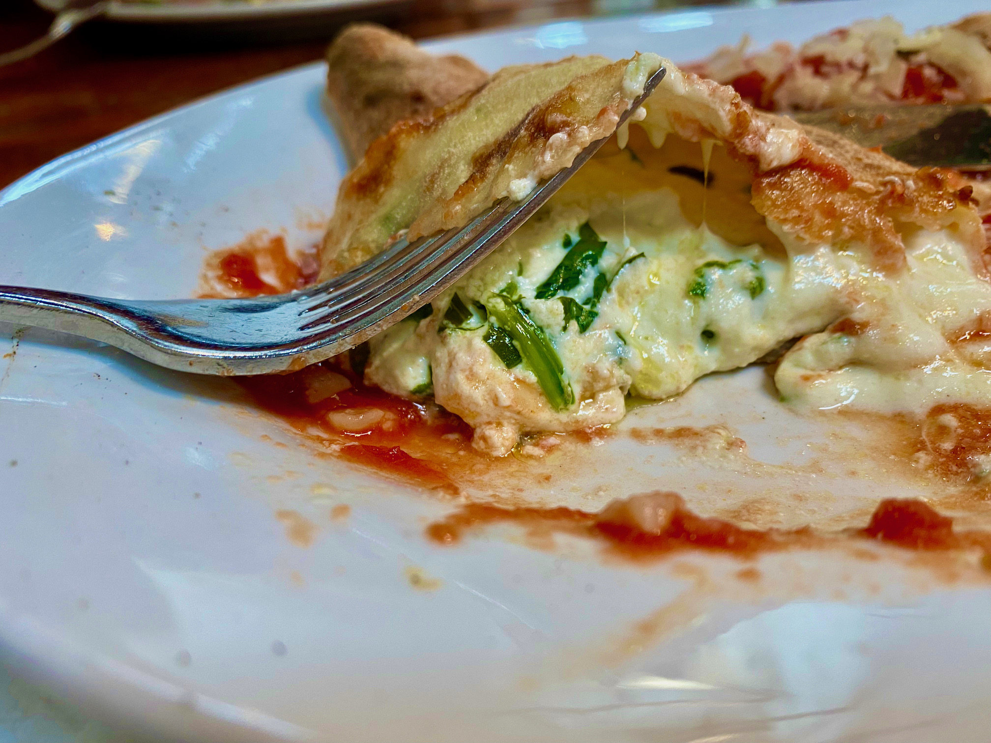 This dough is paper thin…This is super thin calzone dough….gives you more belly room for that rich creamy cheesus filling. BTW- The cheeses are incredible here. For my taste it is a little light on the spinach but it does taste great.