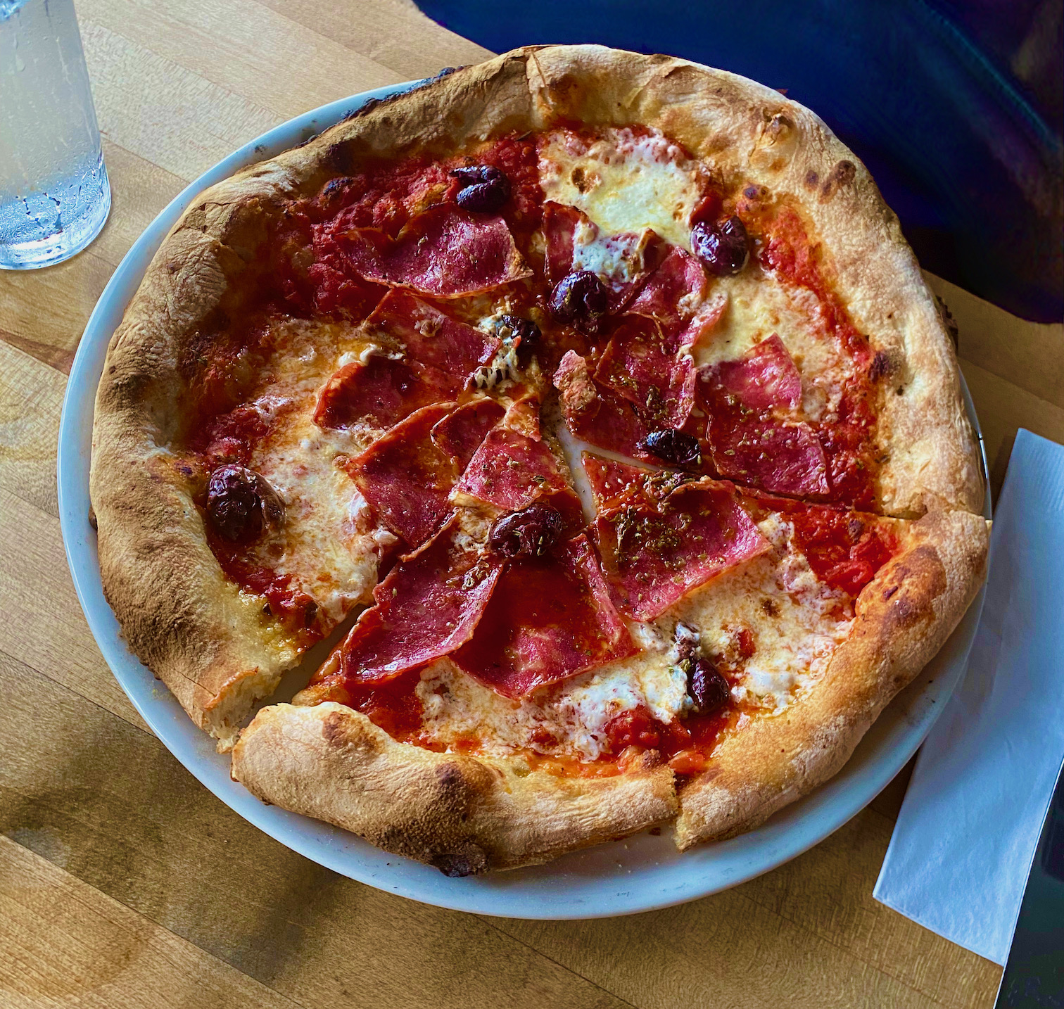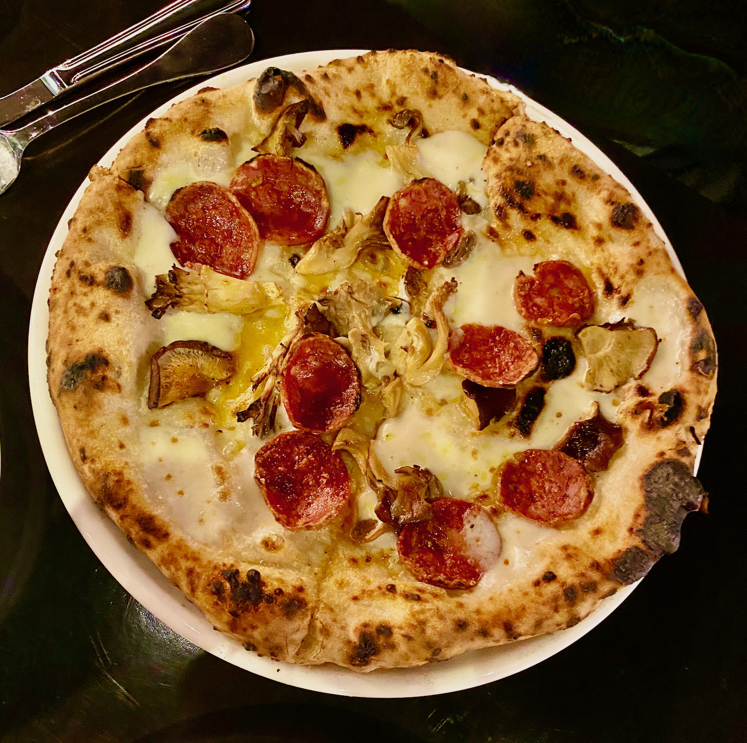 The thinnest non-extra thin pizza that we have received was the mushroom with mozzarella and salamette picante from PA’LA Downtown.