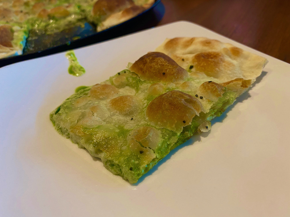 Here is the focaccia di recco in the pesto variety from Pomo.